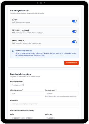 Acceptera betalningar via Swish för snabba mobilbetalningar, eller kort och Klarna via Stripe. Allt integrerat och säkert.